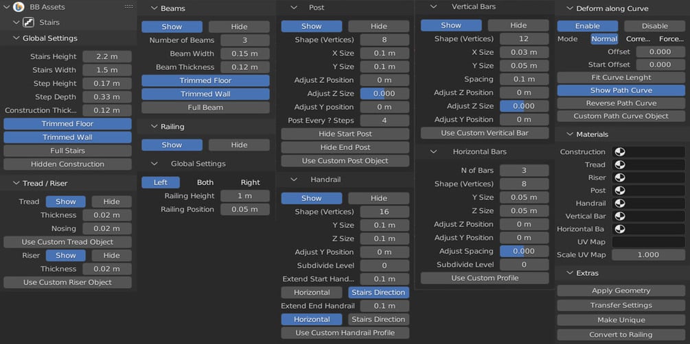 When the Add-on is enabled, in the side panel in the 3d Viewport, you'll see the BB Assets Panel. From there, with a simple click on a button, you can transform any selected object into a stairs or a railings object.